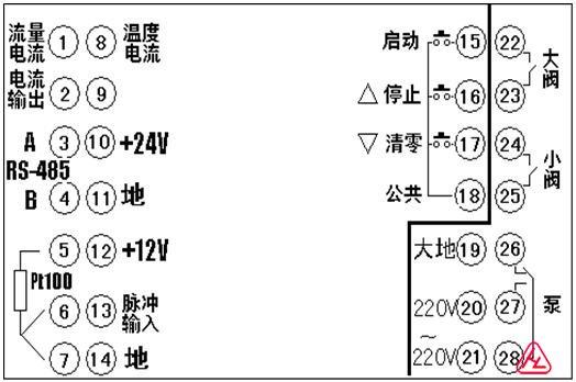 | 1.模擬流量信號輸入;2.流量再發送電流輸出;3.RS-485,A;4.RS-485,B;5.Pt100,A;6.Pt100,B;7.Pt100,B;8. 溫度電流信號輸入;9. 空;10. 24V; | 11.公共地(GND);12. 12V;13.脈沖流量信號輸入;14.公共地(GND);15.發料啟動按鈕;16.發料停止按鈕;17.清零/復位按鈕;18.按鈕公共接點;19.接大地;20.220V; |
