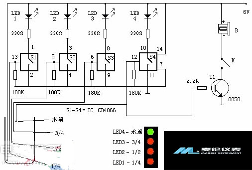 該電路由一片四雙向模擬開關集成電路CD4066為核心構成。每個電路內部有四個獨立的能控制數字或模擬信號傳送的開關。當水箱無水時,由于180K電阻的作用,使四個開關的控制端為低電平,開關斷開,LED不發光。